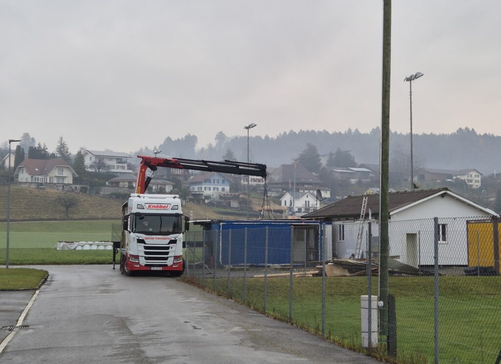 Die maroden blauen Container beim Sportclub Ersigen haben ausgedient und wurden am Freitagmorgen, 5. Dezember 2025 aufgeladen und abtransportiert. Damit entsteht Platz für den geplanten Neubau des Clubhauses und der Garderoben im Moos. Bereits im Sommer wurden die Container geleert, da die zunehmenden Schäden eine weitere Nutzung zu gefährlich machten. Die Sicherheit unserer Mitglieder hatte für uns dabei oberste Priorität.